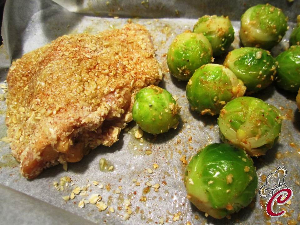 Coprite una teglia con della carta da forno. Ungetela leggermente, quindi adagiatevi il pollo.Irrorate leggermente di olio i cavolini e poneteli accanto al pollo. Cospargeteli con la panatura rimasta e salate a piacere. Versate un filo di olio sulla sovraccoscia, quindi infornate a 200° e lasciate cuocere per 40 minuti, girando il pollo dopo mezz'ora circa, in modo da farlo dorare bene da entrambe le parti. Una volta che sarà croccante in superficie, sfornate e servite.