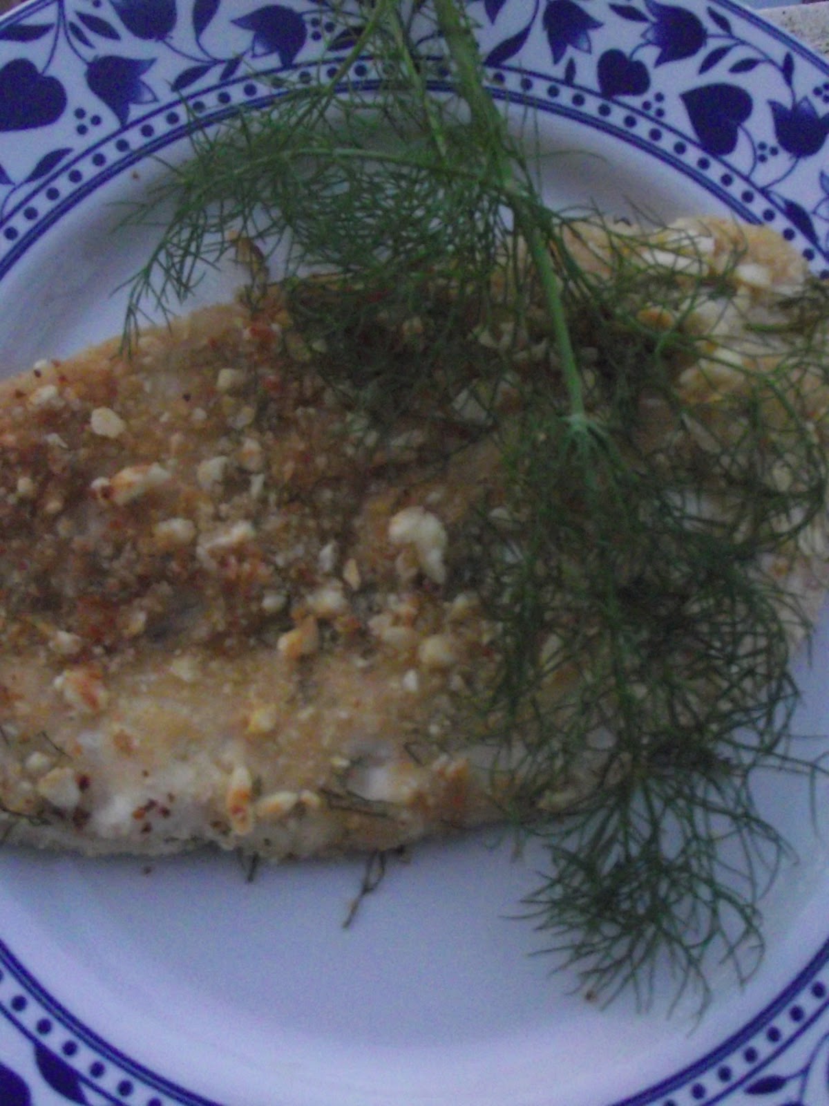 Spezzettate con le mani il finocchietto e mescolatelo con il pangrattato,le mandorle e il sale.Prendete un piatto,versateci l'olio e immergetevi le fette di pollo,in maniera tale da ungere per bene tutta la carne.Passate poi nel composto aromatizzato e cuocete in una padella antiaderente.Volendo,potete friggerle in olio.Io ho preferito rimanere sul leggero ^_^