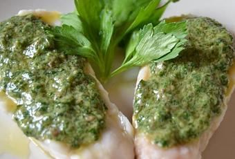 Fintanto che aspettate, preparate la salsa. Sminuzzate in un robot da cucina, le olive, i capperi, il basilico, l’aglio e il prezzemolo. Aggiungete 3 cucchiai di olio e del succo di limone e amalgamate il tutto. Aggiustate di sale e diluite con olio se dovesse essere troppo densa.