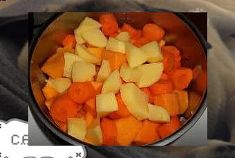 Utilizzando una vaporiera, lessate la zucca, le carote e le patate.