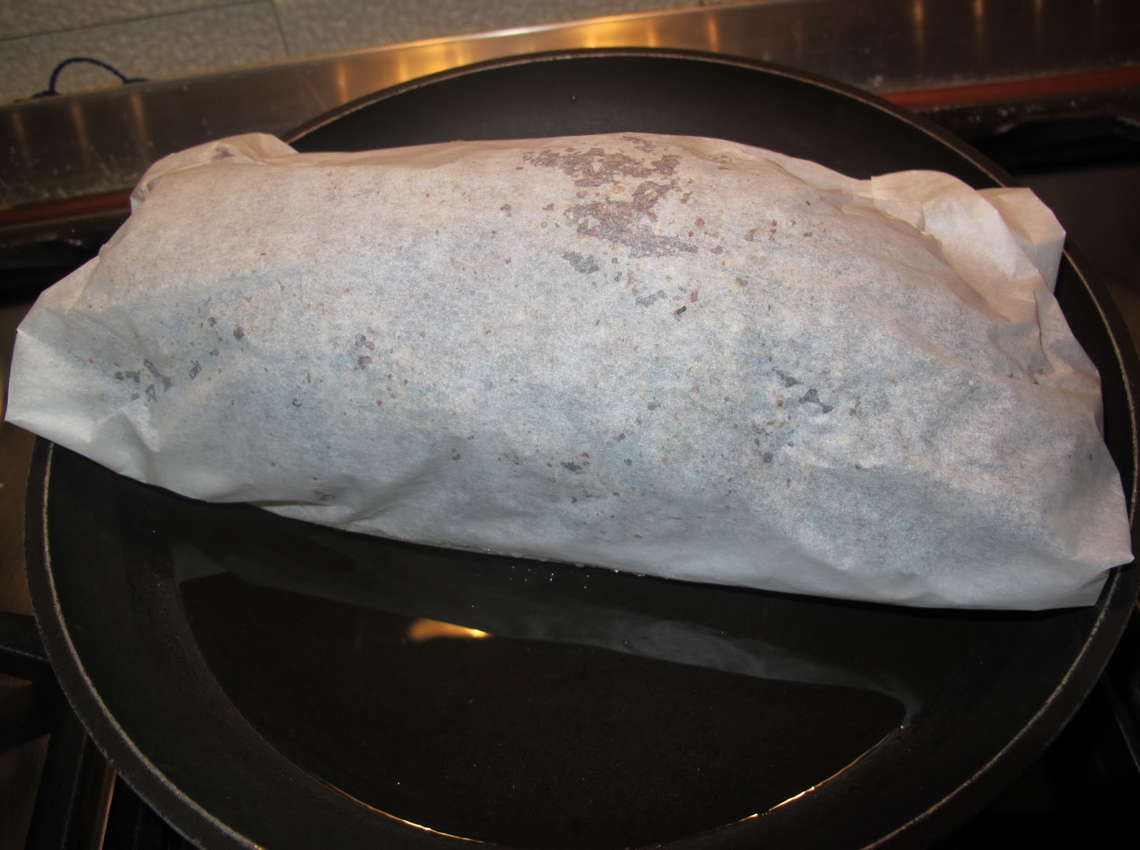 Così avvolto nella carta forno rosolarlo in padella con un filo di olio.