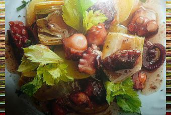 un volta cotto mettete il polpo nei piatti da portata con le patate lessate poi tagliate a fettine insieme ai carciofi mondati e tagliati a metà e qualche fogliolina di sedano