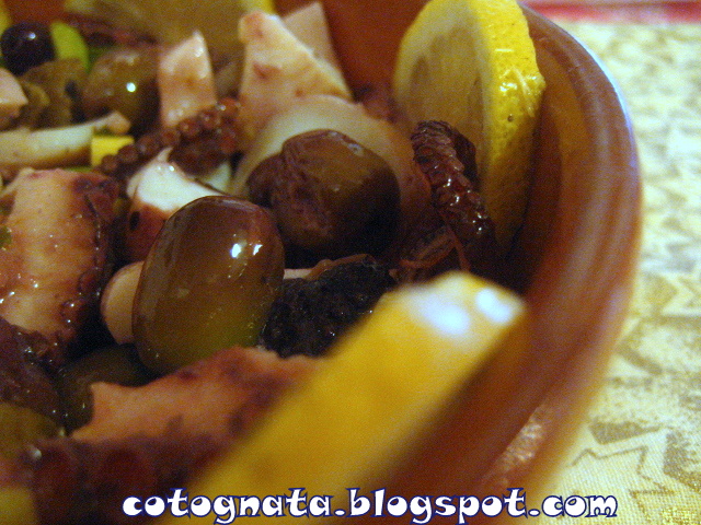 POLPO CON SEDANO E OLIVE NERE500 gr polpo 2 liomoni1 bella costa di sedano metà tazza di olive nereoriganoolio evo sale marinopepe Lessare il polpo con non molta acqua ( mamma di Babette docet: "il polpo si cucina con l'acqua sua stessa") e se non è molto grosso i miei erano mezzanetti potete lessarlo senza stare ad ammazzarvi a tagliarlo a pezzetti prima perchè dopo la cottura risulta bello tenero.