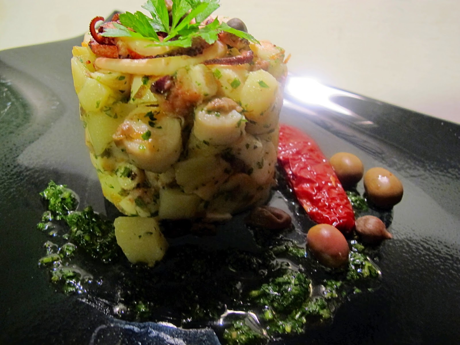 Polpo e patate con olive taggiasche, capperi e salsa prezzemolata