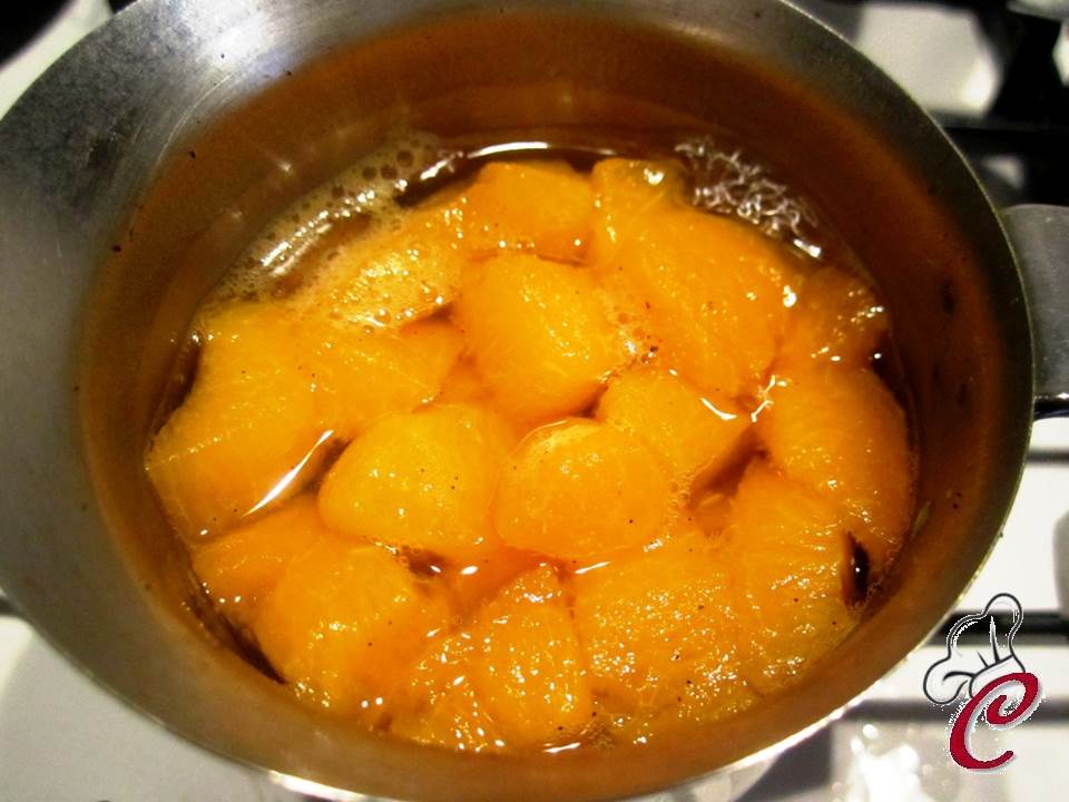 Nel frattempo sbucciate la batata dolce, tagliatela a fettine non troppo spesse e fatela cuocere a vapore, mettendo nell'acqua la stecca di vaniglia utilizzata in precedenza.Private le due albicocche della loro buccia, quindi fatele bollire leggermente in acqua, per ammorbidirle bene. Quando le patate saranno pronte, trasferitele in un boccale, unite le albicocche scolate e frullate. Aggiungete il sale, la farina di mandarino (o la scorza grattugiata di un limone) e l'olio piccante. Continuate a lavorare, con il frullatore ad immersione, fino ad ottenere una crema perfettamente vellutata.