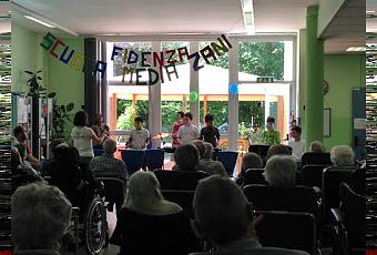 Pomeriggio musicale alla Casa Protetta. Mercoledì 3 giugno i ragazzi della classe 1G, sezione musicale della scuola Media Zani, accompagnati dai Prof. Cocconi e Bodria, hanno allietato il pomeriggio degli ospiti della struttura. Dopo il saluto iniziale del Dirigente scolastico Lorenza Pellegrini e del responsabile della struttura.
