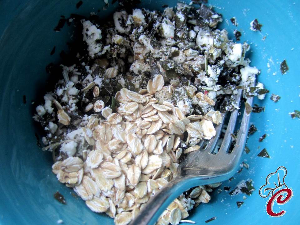 Nel frattempo preparate il ripieno. Mettete in ammollo in poca acqua il foglio di alga kombu, in modo da farla ammorbidire e reidratare. Tritate con una mezzaluna il rosmarino lavato e asciugato e le noci. Mischiateli alla feta, schiacciando tutto con una forchetta, quindi aggiungete i fiocchi di avena, l'alga kombu, che avrete sgocciolato e tamponato bene per togliere l'acqua in eccesso, tagliata a striscioline e aromatizzate tutto con il pepe, nella quantità che riterrete opportuna secondo i vostri gusti. Io non ho aggiunto sale per la sapidità della feta e dell'alga stessa, ma considerate che il pomodoro rimarrà piuttosto dolce. Non abbondare di sale è importante, per cui sfruttate i sapori degli ingredienti utilizzati, per imparare a diminuire il suo utilizzo ^_^