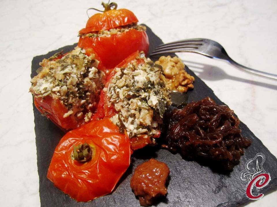 In silenzio ho chiuso i battenti, per qualche settimana. Non sapevo neanche io per quanto si sarebbe protratta l'attesa del ritorno e oggi sono nuovamente qui, forte dell'invito a cena ricevuto dalla dolcissima Erika. E' difficile, in questo periodo, trovare il tempo per programmare. Se da una parte il lavoro mi sta particolarmente provando (ferie??? E' un termine in cui credo solo perché è il fine ultimo del mio lavoro ^_^), dall'altra vivo di improvvisazioni. Vado dove mi dice il cuore, libera da vincoli, figlia dell'istinto. E mi arricchisco di tutte quelle emozioni inevitabili. Così anche questo piacevole appuntamento con un'amica scoperta sulle pagine di un blog diventa uno spunto e uno stimolo. Mi ha fatto davvero molto piacere essere la destinataria di questo invito. Non mi presento alla sua tavola con un dessert, come ci si potrebbe immaginare. Io rimango quella strana e a cena porto un pomodoro ripieno ^_^Pomodoro dell'orto di mamma, di cui vado fierissima, arricchito con un concentrato di ingredienti che amo alla follia. Abbinato a sapori nettamente contrastanti e rispettoso dei miei soliti e sani principi di benessere. Insomma, i sapori di questa proposta sono così ricchi e insoliti da rimanere impressi sul palato e.... direttamente nel cuore.