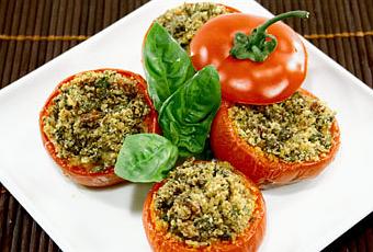Mettete in una ciotola il pangrattato, aggiungete le acciughe, i capperi tritati, l’aglio schiacciato, il prezzemolo, il basilico tritato, l’olio, il sale e tanto brodo quanto basta per ammorbidire il ripieno senza renderlo però liquido. Riempite i pomodori con il ripieno e poneteli in una teglia leggermente unta.