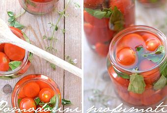 Lavate e asciugate ,tamponando con carta da cucina, le foglie di maggiorana e basilico.Sistemare i pomodori nei barattoli, alternando con foglie di maggiorana e basilico.