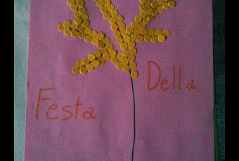 Per il nostro bigliettino abbiamo continuato ad usare, come per San Valentino, delle paillettes per creare i fiorellini della mimosa attaccati attorno al ramo disegnato con il pennarello.