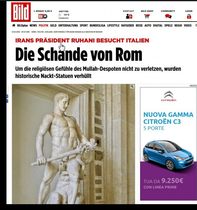 Poteva essere una soluzione : un bel paraocchiDal Paìs alla Cnn alla Bild, tutte le testate internazionali hanno riportato la notizia delle statue coperte in Campidoglio, in occasione della visita del presidente iraniano Rouhani. Il caso è diventato politico e sta scatenando numerose polemiche