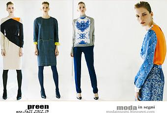 Colori accesi scanditi a blocchi, stampe decorative effetto vaso cinese, movimenti geometrici illuminati d'arancio zuccoso. Questa è la pre-collezione per l'inverno 2012 di Preen che comunica con volumi classici che non disdegnano l'over e tinte accese come il turchese o il giallo. A volte ricorda Jonathan Saunders... ma che ora ricordi qualcosa non è un male visto che come collezione sembra essere nata per essere dimenticata!