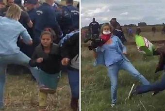 La ineffabile reporter ungherese Petra Laszlo che sgambetta un uomo in fuga con in braccio un bambino.