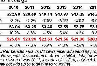 eMarketer riprende i dati di comScore su i primi 10 quotidiani online al mondo pubblicati, anche, in questi spazi a metà di dicembre. Vengono inoltre diffusi i ricavi pubblicitari dei quotidiani statunitensi dal 2010 ad oggi e le proiezioni sino al 2016 suddivise tra carta e online.