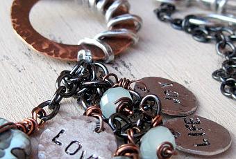 Un mix di colori e di metalli: catena gunmetal, filo di alluminio, lamina di rame, filo di rame, un mix che mi piace moltissimo.