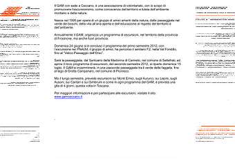 IL PROGRAMMA DELL'ATTIVITA’ DEL 2° SEMESTRE DEL GAM DI CECCANOIl GAM con sede a Ceccano, è una associazione di volontariato, con lo scopo di promuovere l’escursionismo, come conoscenza del territorio e tutela dell’ambiente montano e della natura.