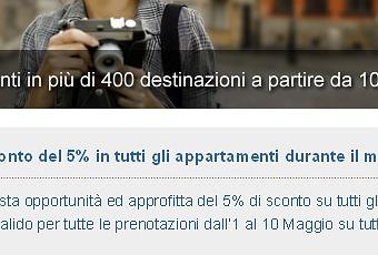 Dal 1 al 10 maggio approfitta di questa promozione e accaparrati un 5% di sconto su tutti i nostri appartamenti. Adesso non ti rimane altro da fare che far volare l’immaginazione, decidere dove fare il tuo prossimo viaggio e introdurre il seguente codice nel campo richiesto