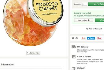 Le Prosecco Gummies risultano di fatto ancora in bella vista sul sito web SugarSin, ma risultano "out of stock": non disponibili. Chi invece continua a dichiarare di averne in magazzino è il department store John Lewis, una catena di grandi magazzini di vendita al dettaglio che può contare su una rete ben consolidata nel Regno Unito. Da Glasgow a Manchester, da Newcastle a Cambridge, senza dimenticare Cardiff, Birmingham e i tre megastore di Londra. Sul sito web della John Lewis ne risultano "more than 10 in stock". Proviamo allora a procede all'acquisto online, al prezzo di 6,50 sterline, lo stesso precedentemente praticato dalla SugarSin per un barattolo da 250 grammi di Prosecco Gummies. La consegna all'estero non è prevista e proviamo dunque a richiedere il ritiro in uno degli store della catena. Basta inserire l'indirizzo e il gioco è fatto. Alla modica cifra aggiuntiva di 2 sterline. Le caramelle taroccate al Prosecco ci sarebbero così costate 8,50 sterline. Quasi 11 euro, insomma, per 250 grammi di orsetti dal "delizioso sapore di frizzante/scintillante prosecco". Un affare, no?