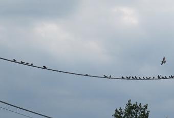 Sul filo accanto a casa mia, nel profondo nord-est, provavano a strutturare lo stormo: ripetutamente disturbate da tre ragazzini, tre fratelli che vociavano alla ricerca del loro cagnolino, si disperdevano, riprovavano.