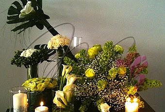 Nota: la composizione sulla vostra destra è per una zona di accoglienza ospiti che la sposa ha voluto espressamente diversa dallo stile del resto , stessi fiori ma forme diverse. Molte candele (vabbè io ne ho messe poche) e un po' glitter per illuminare visto che la cerimonia sarà di sera...