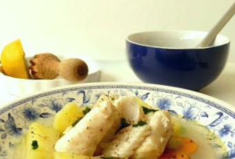Procedimento:Sbucciare le patate, lavarle e tagliarle a spicchi. Lavare le carote sott'acqua corrente spazzolandole con uno spazzolino da cucina e tagliarle a rondelle. Sbucciare la cipolla e tagliarla in quattro. Lavare il gambo di sedano e tagliarlo a tocchetti.Mettere un litro e mezzo di acqua in una pentola, salare e unire tutte le verdure insieme alla foglia di alloro e i grani di pepe. Far lessare per 20 minuti da quando stacca il bollore.Mentre le verdure si stanno lessando pulire il pesce, lavarlo e tagliarlo a tranci. Aggiungerlo alla pentola dopo i 20 minuti di lessatura delle verdure, versare 2 cucchiai da minestra di olio evo e continuare la cottura per altri 20 minuti.Ritirare dal fuoco, togliere con la schiumarola il pesce e metterlo in un piatto. Togliere anche le verdure e metterle in un altro piatto. Filtrare il brodo e versarlo in una pentola pulita. Pulire il pesce da pelle e lische e mettere pesce e verdure nel brodo. Accendere il fuoco, cuocere ancora per 5 minuti, versare succo di limone a piacere, mescolare delicatamente e spegnere.Macinare del pepe nero e servire.