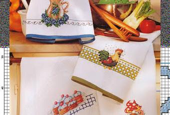 Questi strofinacci da cucina sono realizzati ricamando a punto croce su tela aida 55 quadretti con cotone mulinè a tre fili. Bellissimi e facili da realizzare anche per le principianti