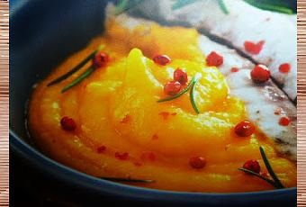 la zucca mantovana utilizzata per questo purè è l'ingredienti prediletto della zona di Mantova grande tondeggiante e la sua scorza spessa racchiude una polpa soda e croccante diventa morbida e pastosa sviluppando una piacevole dolcezza in questa ricetta il purè viene accostato agli sgombri al rosmarino inedito accostamento di mare e terra