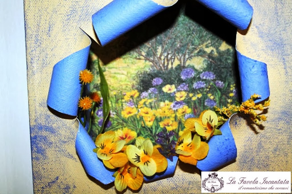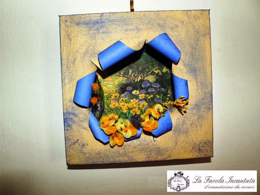 L'altro quadretto invece mostra sullo sfondo un prato estivo fiorito, con fiori gialli e viola, mentre in primo piano ho applicato delle violette gialle e qualche rametto di mimosa.