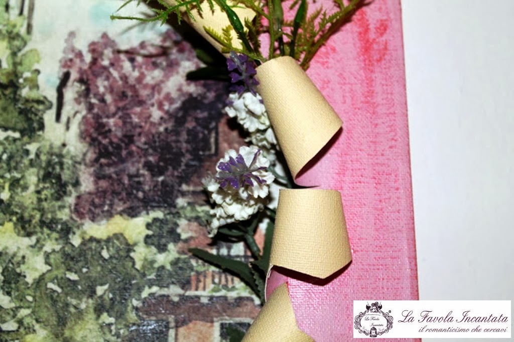 Il primo quadretto mostra sullo sfondo lo squarcio di un paesaggio primaverile, mentre in primo piano ho applicato dei fiorellini bianchi e lilla e rami verdi...