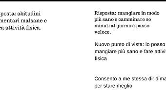 Ora che avete adattato la mia domanda alla situazione che volete risolvere prendete un foglio e create due colonne. Nella prima scrivete la domanda “cosa mi impedisce di…?” e nella seconda “Che cosa posso fare per cambiare questa situazione?”.