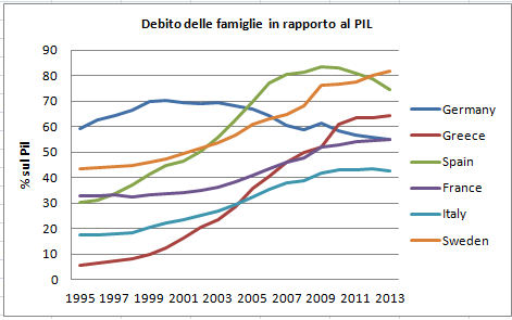 Ad esempio, si potrebbe partire con questo grafico, che ci consente di osservare la dinamica del debito delle famiglie nei paesi considerati.