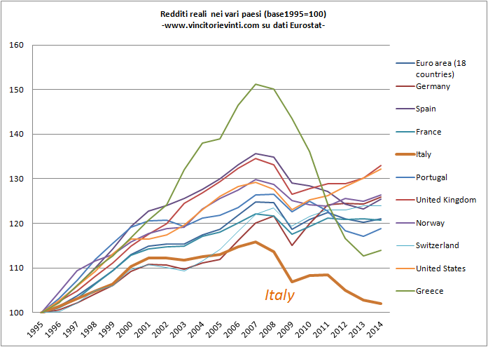 Secondo voi, a quale paese appartiene il primato per la performance peggiore dei redditi reali, dal 1995 in avanti? Alla Grecia? NOOOO!!!! Al Portogallo? NEMMENO PER SOGNO. Alla Spagna? NEANCHE A DIRLO. APPARTIENE ALL'ITALIA, che attualmente "vanta" un reddito reale pro capite analogo a quello che aveva nel 1996. Nessuno, dei paesi considerati, riesce a fare peggio dell'Italia. Nemmeno la disastrata Grecia. Però vi dicono che siamo in ripresa....
