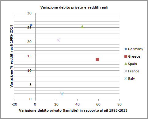 Infatti, mettendo insieme la variazione del debito privato e la variazione del reddito reale nel periodo 1994-2014, otteniamo il seguente grafico