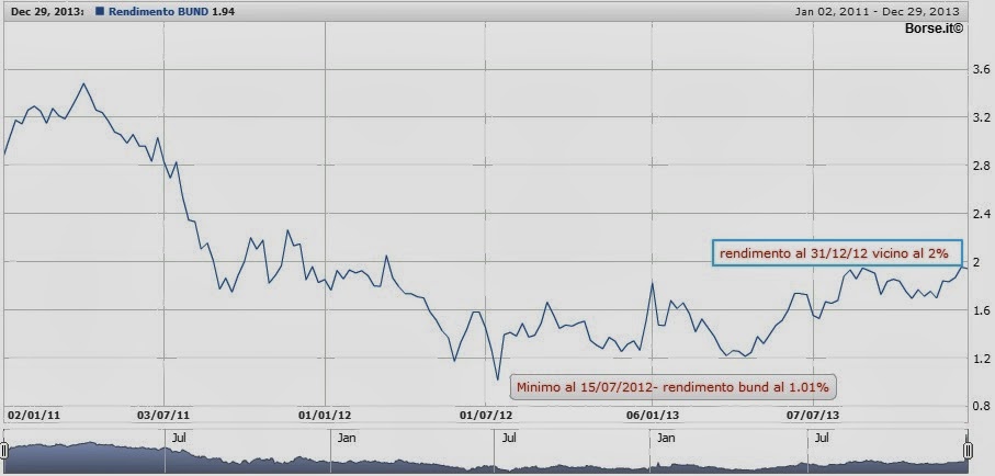 Sempre a quell'epoca (cioè al 15/07/2012) il rendimento del Bund tedesco era all'1.01%. Mentre oggi, invece, è a quasi al 2%, ossia circa 100 punti in più di allora.