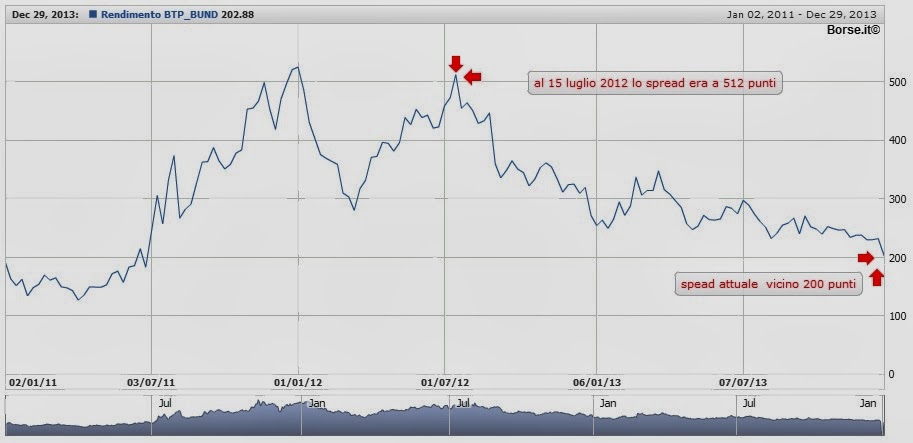Arriviamo allo spread. Sempre nel luglio del 2012 (il quindici, per l'esattezza) il differenziale di rendimento tra il Bund tedesco e il Btp italiano era a 512 punti. Mentre oggi è a ridosso dei 200 punti. Un calo di oltre 300 punti dai massimi dell'epoca.