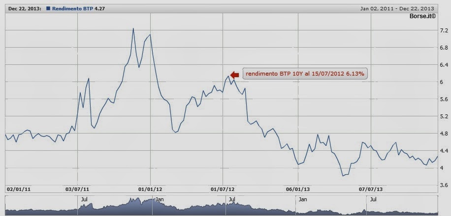 Dopo 7 mesi di governo Monti il rendimento del BTP decennale, alla data del 15 luglio 2012, era al 6.13%.