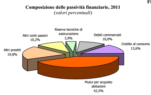 A fine 2011 le passività finanziarie delle famiglie italiane, pari a 900 miliardi di euro erano costituite per circa il 42 per cento da mutui per l’acquisto dell’abitazione; la quota di indebitamento per esigenze di consumo ammontava a circa il 13,6 per cento, le rimanenti forme di prestiti al 20 per cento così come i debiti commerciali e gli altri conti passivi