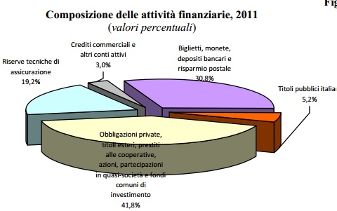 Omettendo di entrare nei meandri della metodologia adottata da Bankitalia per quantificare la ricchezza delle famiglie, dal rapporto emerge che, alla fine del 2011, la ricchezza netta delle famiglie italiane era pari a circa 8.619 miliardi di euro, corrispondenti a poco più di 140 mila euro pro capite e 350 mila euro in media per famiglia. Più precisamente, secondo quanto riportato dal rapporto, alla fine del 2011 le attività reali (5.978 rappresentavano il 62,8 per cento della ricchezza lorda, le attività finanziarie (3.541 miliardi di euro) il 37,2 per cento e le passività finanziarie (900 miliardi di euro) il 9,5 per cento.