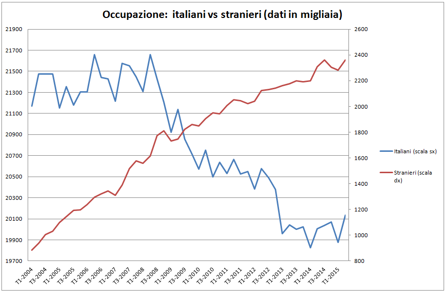Si osserva che, dall'inizio della crisi, gli italiani (linea blu, scala sinistra) hanno perso un milione e settecentomila posti, mentre gli stranieri (linea rossa, scala destra) ne hanno guadagnati circa 700 mila. La realtà è che, nella maggior parte dei casi, l'occupazione degli stranieri viene preferita per via del basso costo della manodopera, contribuendo così alla svalutazione salariale. Questo fenomeno rischia di arrecare danni ben più ampi all'economia, per il semplice motivo che una forza lavoro a basso costo e poco qualificata potrebbe disincentivare i datori di lavoro ad investire in tecnologie e fattori più evoluti e più produttivi, traendo profitto (di breve periodo) utilizzando l'abbondanza di manodopera poco pagata, ma poco produttiva.
