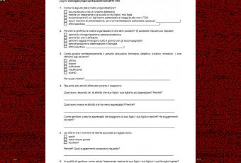 Chiediamo qualche minuto del vostro tempo per rispondere ad alcune domande che ci permettono di verificare la percezione della nostra proposta. Il vostro contributo è per noi prezioso in quanto ci permette di cominciare a pensare alle in iniziative della prossima estate da estendere ai vostri ragazzi o ai loro coetanei.