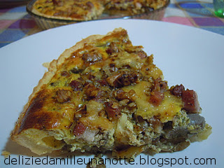 PER LA FARCITURA: 500 gr di funghi misti 2 uova 100 gr di ricotta cremosa 80 gr di speck a dadini 30 gr di noci tritate 50 gr di emmenthal cipolla tritata prezzemolo, sale e pepe q.b. Preparare la brisè: Mettere tutti gli ingredienti in un mixer, ed impastare. Fare un panetto e fare riposare in frigo per 30 minuti circa. Nel frattempo pulire e tagliare i funghi, e farli cuocere in una padella con olio, poca cipolla tritata e prezemolo. Fare raffreddare. Sbattere le uova aggiungere la ricotta, aggiustare di sale e pepe, ed unire i funghi una volta che si sono raffreddati. Stendere la brisè e foderare una teglia, versarvi il composto di uova e funghi, e su questo distribuire lo speck, il formaggio tritato e le noci.