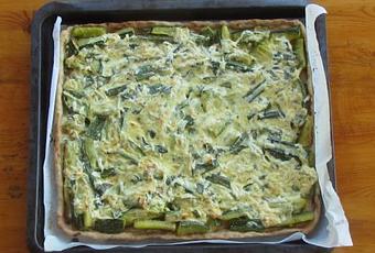 In un mixer ho messo l'olio e la farina, ho fatto fare un giro ad alta velocità, si formeranno delle briciole, ho aggiunto l'acqua fredda e il sale e ho fatto andare ancora per pochi secondi, si formerà una palla, l'ho estratta e lavorata per poco e ho messo a riposare in frigo per 30 minuti. Per il ripieno: ho rosolato in padella le zucchine tagliate a bastoncini insieme allo scalogno sbucciato e affettato e un filo d'olio extravergine di oliva, salare e tenere da parte. Ho ripreso la pasta dal frigo, l'ho stesa direttamente nella teglia quadrata e ho aggiunto le zucchine, ho sbattuto le uova con la panna, e la ricotta salata grattugiata e qualche foglia di basilico spezzettata e pepe. Ho versato il composto aggiunto sopra al composto di zucchine e cotta in forno a 180° per circa 25 minuti. Ottima anche fredda. Mi dispiace non aver avuto modo di fare la foto della fetta...avevo ospiti e quindi non ho avuto tempo...