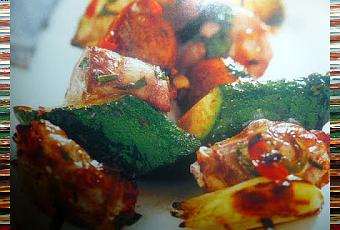 ungete di olio una padella antiaderenti infilzate 4 spiedini con alternando la rana pescatrice la zucchina i funghi e la cipolla fate saltare fino a che gli spiedini non saranno pronti servire guarnendo se volete con crescione o prezzemolo a piacere
