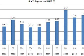 Sulla base del modello di scoring di Altman, che combina indici di flessibilità aziendale, di autofinanziamento, di redditività e di indipendenza da terzi, viene stimata la probabilità di fallimento o merito creditizio di un settore negli anni successivi. In particolare si analizza l’andamento della probabilità di default (e del rating) per il settore legno e mobili, che passa dallo 0,82% nel 2002 all’1,33% nel 2011 (graf.1), per l’industria cartaria che passa dal 2,55% al 2,64% (graf.2) e per stampa-editoria dall’1,75% al 2,47% (graf.3).