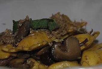 Quando l'acqua della pasta arriva a bollore, cuocete i ravioli e condite con i funghi e come tocco finale una grattuggiata di tartufo bianco ma va benissimo anche del parmigiano.