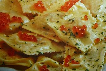 preparate il condimento tritate 2 scalogni uniteli al vino e fate ridurre il liquido aggiungere i ravioli un pizzico di trito di aromi aggiungere la panna fate saltare a fuoco vivo servite con una cucchiaiata di u
