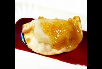 Disponete a specchio sul piatto la riduzione al Porto, adagiatevi sopra il raviolone ripieno di BAGOSS e completate con la marmellata di fichi.