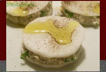 Affettare il daikon creando dei dischi , potete tagliarli sottili con una mandolina o lasciarli un pochino più spessi. (sottili ricordano di più i ravioli).