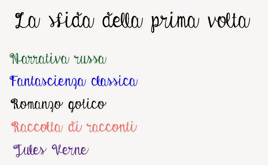 La seconda sfida che mi propongo è una del tutto nuova per me, la SFIDA DELLA PRIMA VOLTA. Essa nasce dal desiderio di cimentarmi con autori/generi mai affrontati fino a ora. Alcune categorie medito di leggerle da tanto, altre invece non erano nella mia mente da tempi lunghi, ma mi sono detta: "Provare non fa mai male". Che siano dunque desideri recenti o remoti, essi rappresenteranno per me pur sempre una prima volta. Ed ecco dunque le 5 categorie scelte: